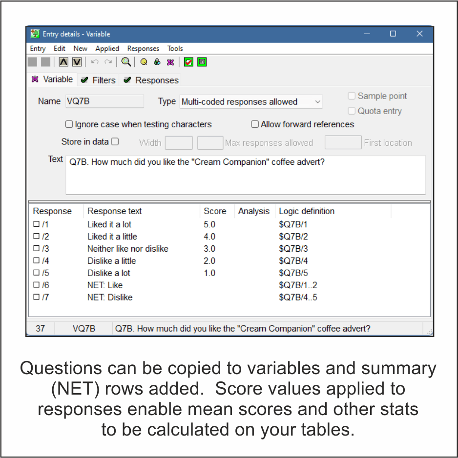 program includes extra time saving solutions. These include “block response updates” to add score values and reject responses to many 100s of entries simultaneously, and a “block paste special” facility where sets of questions, filters and variables can be copied, pasted and renamed with all definitions updated - perfect for product tests!