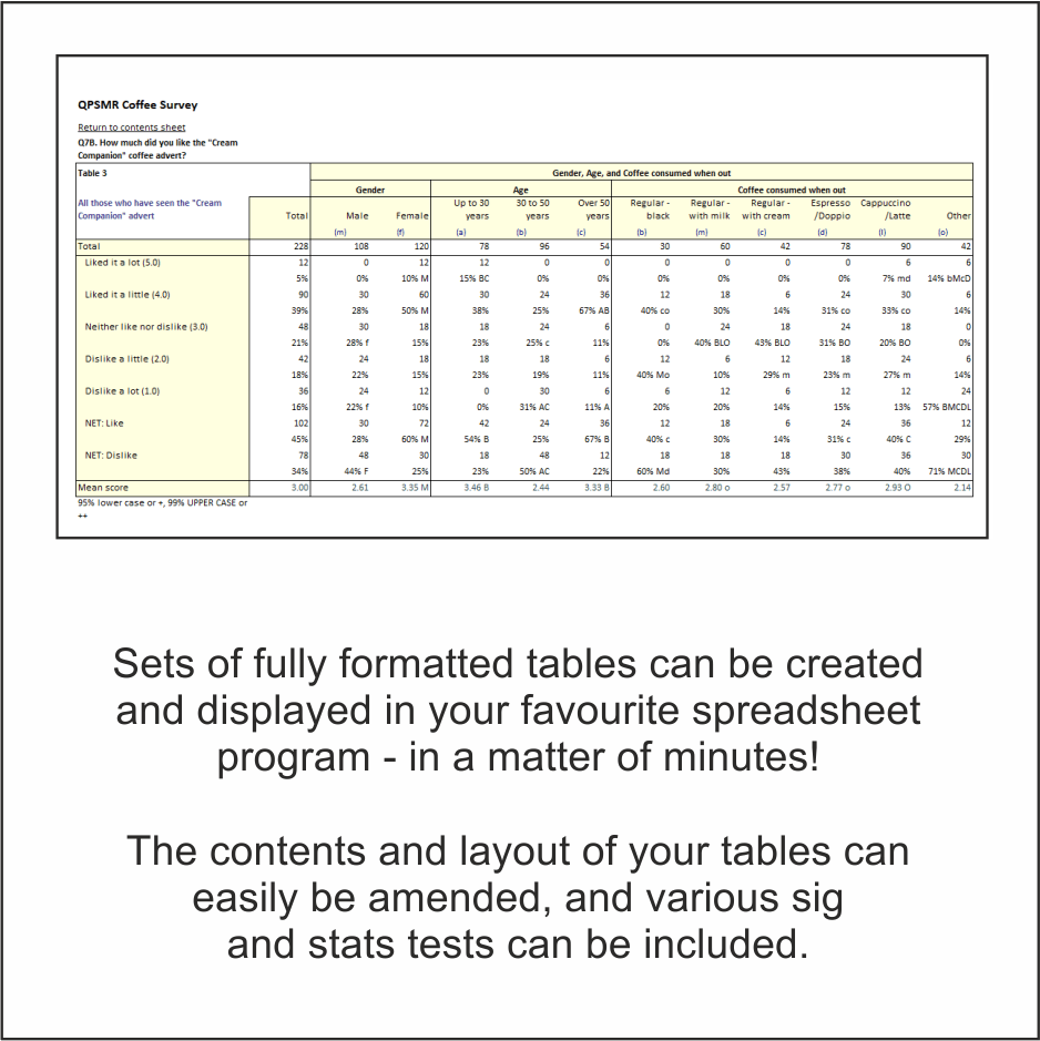 The data you collect, or information from almost any other program, can easily be analysed using the powerful cross tabulation system included in QPSMR Companion Insight.